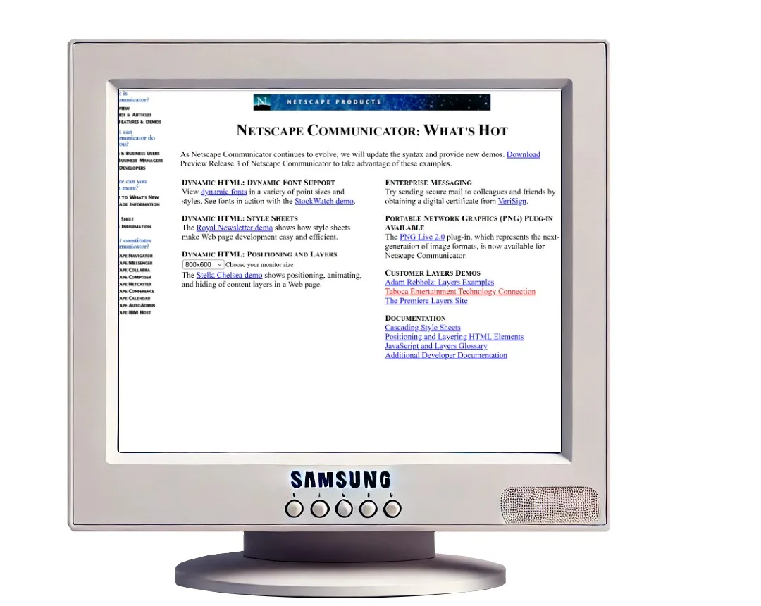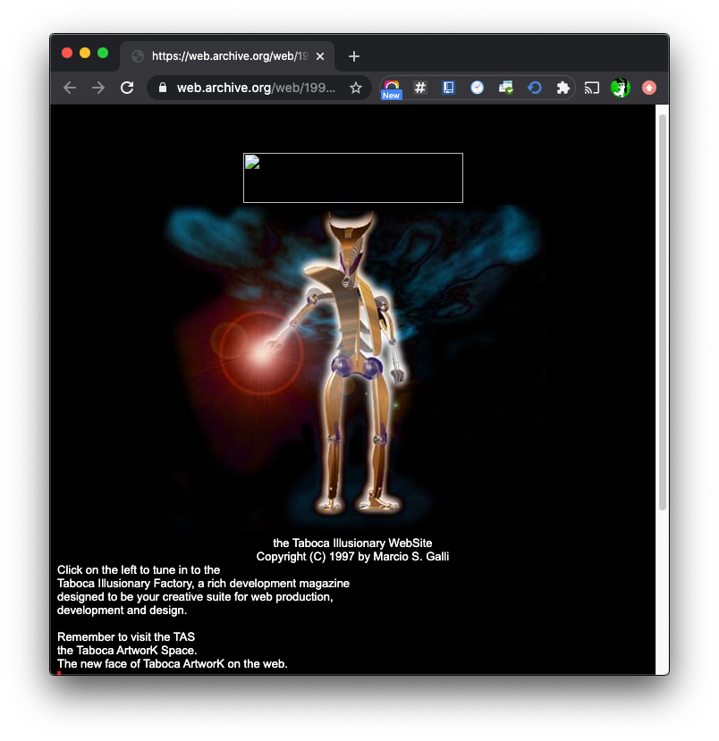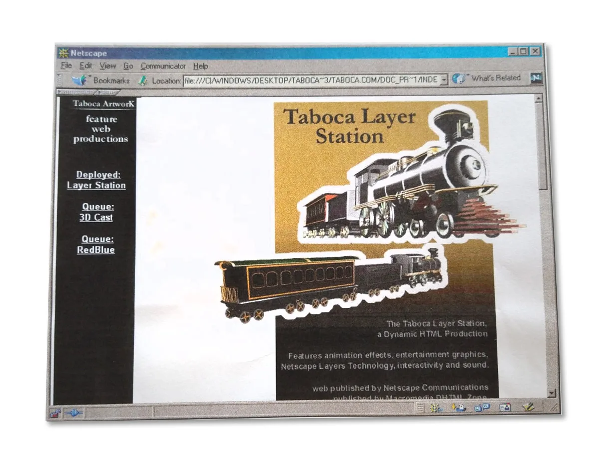 This documents celebrates a historical moment of the web - the rise of DHTML - dynamic HTML. The following are links to web site productions done as internal projects - under the brand site Taboca Artwork. These were workings made to showcase new ways to bring graphics and content with dynamism over web pages.