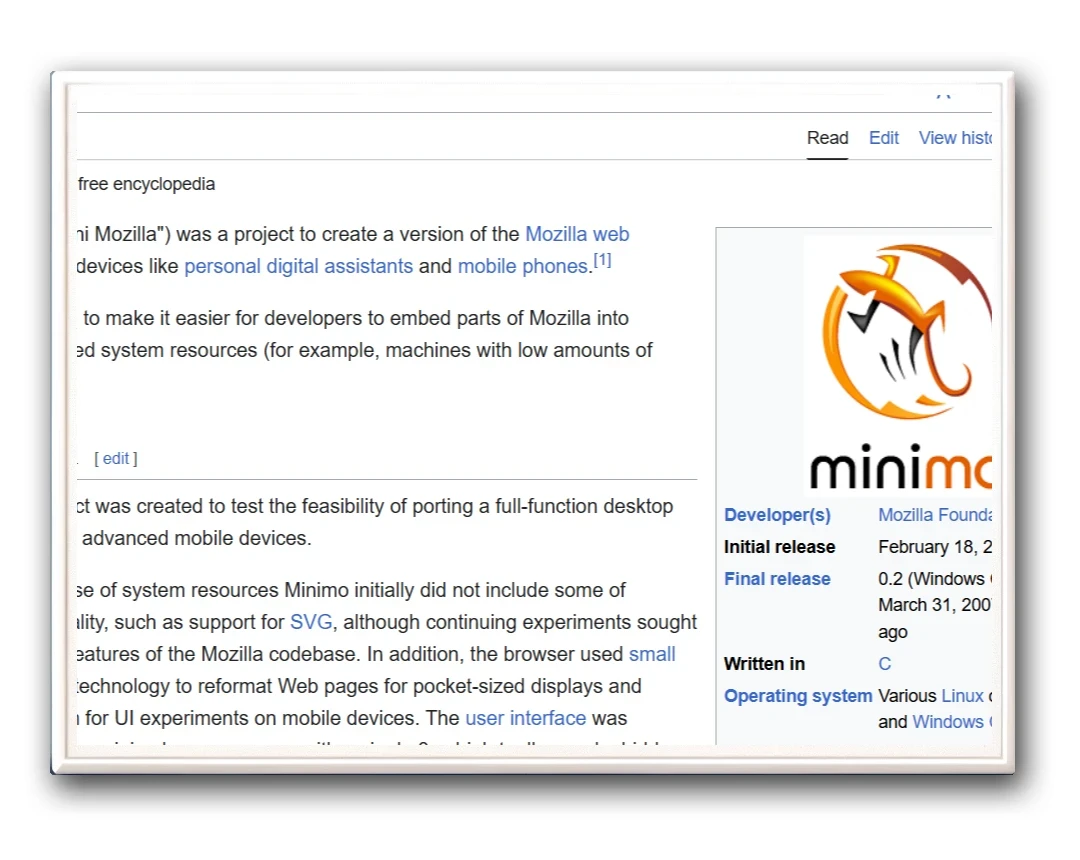 The Mozilla Minimo Project was the first attempt to port Mozilla's full-featured browser engine to mobile devices. This ambitious project aimed to deliver the powerful capabilities of the Gecko rendering engine in a resource-constrained environment, such as PDAs and early smartphones, which typically had limited RAM, storage, and processing power. Some characteristics of Minimo: