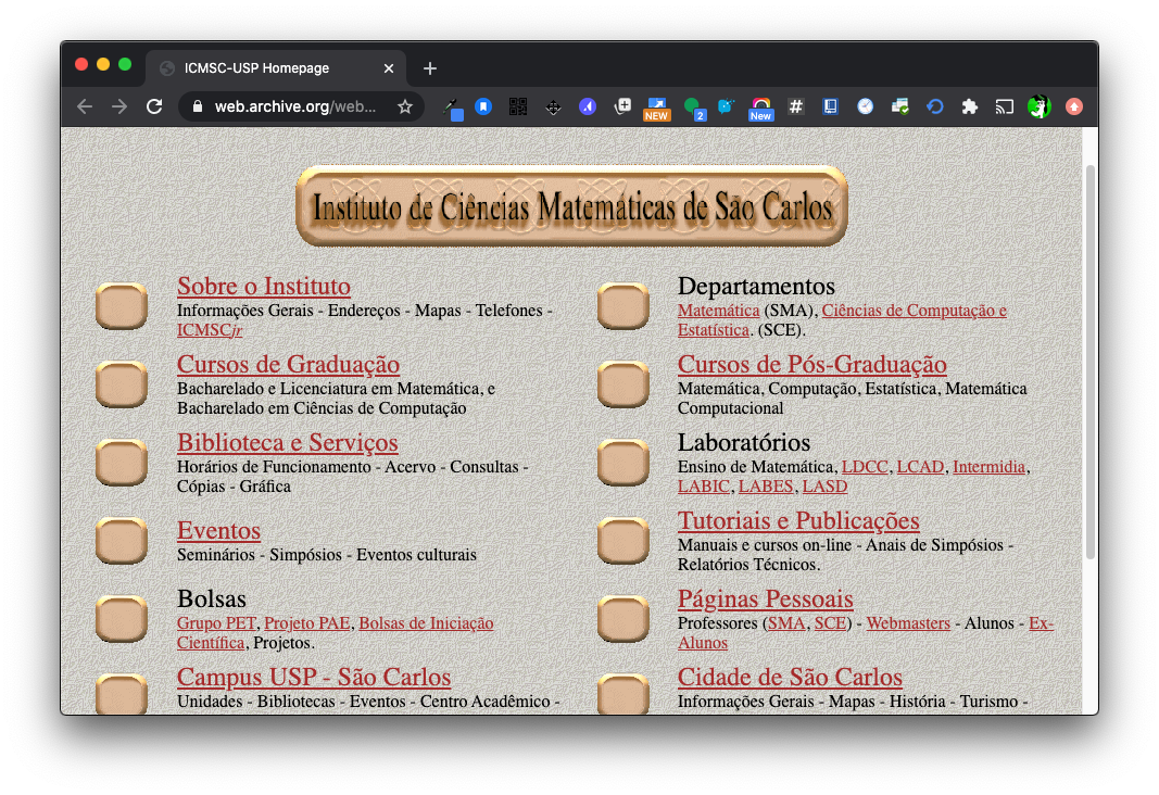 I helped the master at ICMC with the icons and graphics. All of the following graphic list icons (basically the same golden tablets) and the top banner were produced using 3D studio. Notice that the background of the top banner was made to look like a golden metal bar with and it includes a lot of logos of the institution. This institution is/was the mathematics and computer science department of University of Sao Paulo (ICMC USP).