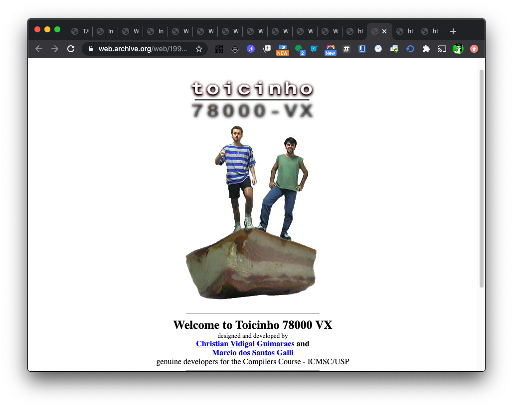 The bacon compiler project, or Toicinho Compiler. Above, myself and Christian, adapted over a very big bacon. Our goal was to have a profissional web site intended to get better grades for our compiler project. No pigs were harmed during this process, the bacon piece was purchased.